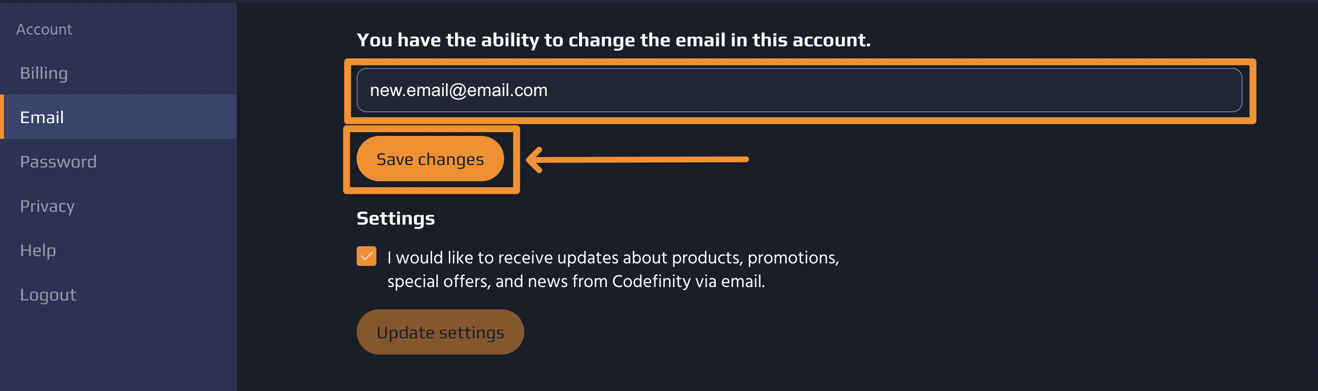 3. Enter your new email address, and once ready, click on the Save Changes button.